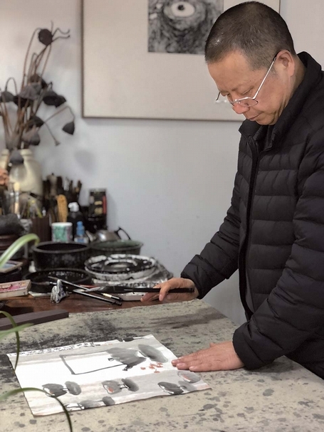 吳鳴的工作室怡陶園與家宅合一,就在丁蜀鎮上,小院裡不經心地種植著花草,養了一隻活潑可愛的柯基犬。進門即見一張大畫桌,各式畫具、圖冊、乾燥植物樣本堆壘在桌邊,筆硯未乾,桌面放滿了剛完成、未完成的水墨作品,透露出主人豐富的思緒與旺盛的精力。