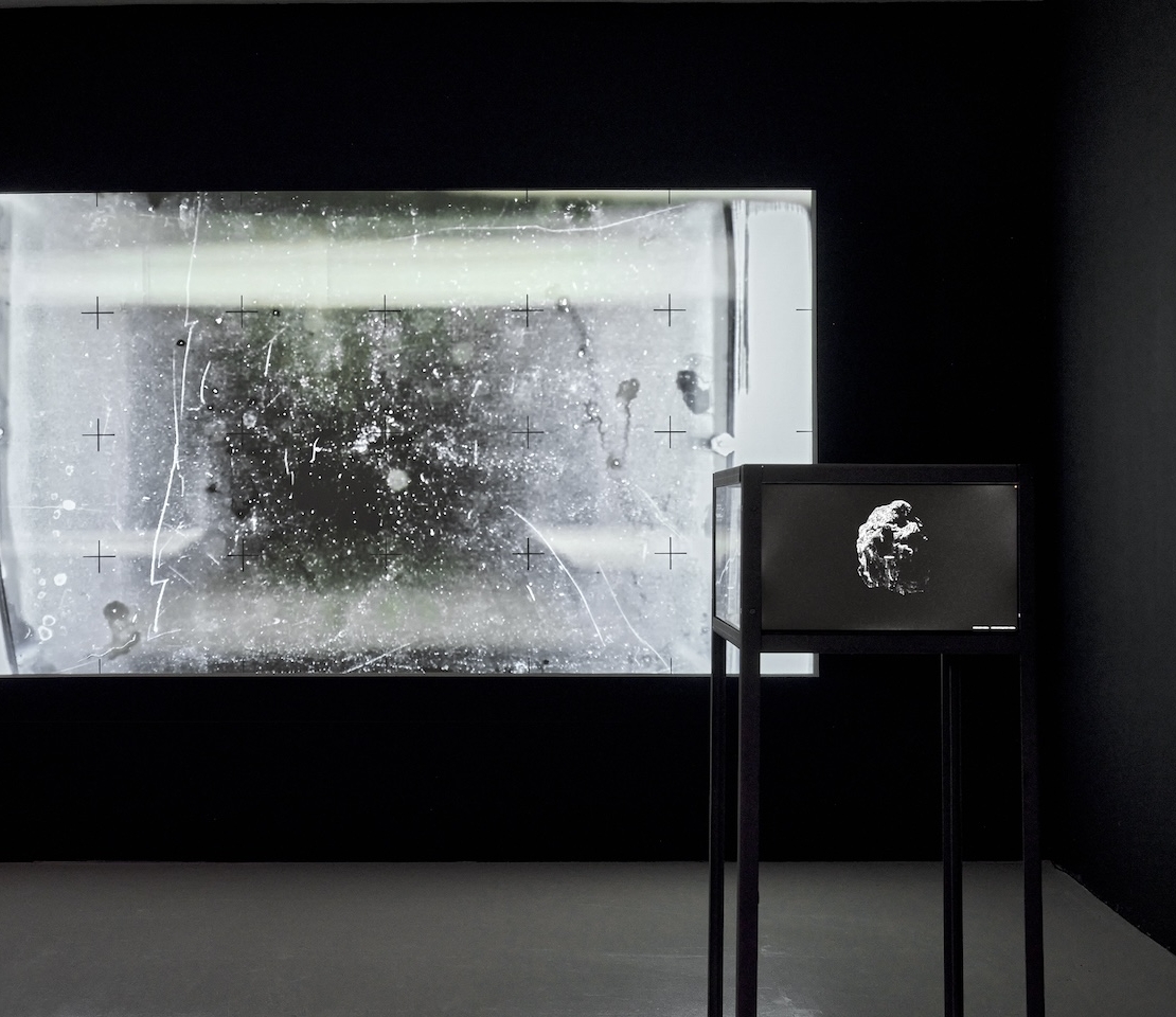 展場入口往右,可以聽到張永達「寂靜的回聲」的低吟。張永達這次在里昂的個展出了八件作品,圍繞在將平時我們日常鮮少注意的自然現象與自然間的能量轉化成我們人體可以直接體驗的型態。看似與李亦凡截然不同,但張永達的作品卻也關心著相關的事:身體、感知、知與識。曾在2020台北雙年展展出張永達的《scape. unseen-sample T》,在當屆展覽論述支撐下,乾淨地表達策展人布魯諾.拉圖(Bruno Latour)想要梳理的當代議題:在人類活動威脅著自然生態的持續下,我們如何去看待自身在蓋婭間的位置?《scape. unseen-sample T》的設計傳導了自然山河間的自然科技,河流與石子的搬運刻劃了在這些活動行進間的物質,導致風化與形態改變。作品雖是以自然現象敘述議題,放大探討風化運動卻也運用空氣酸鹼值提出人類活動在之間微小的關係。這次的個展更以從2011年他在日本駐村時,遇到福島核災的發想,抽絲剝繭放射於我們人類活動中的存在。