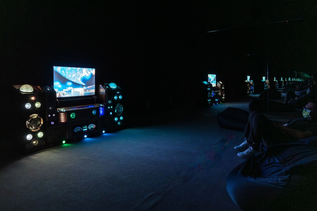 劉窗《飽食終日的我》則是在一間充滿鏡子無限反射的空間中,設置一座像是太空船操作面板的家庭娛樂設備,該設備是兩千年初期流行於中國,設備中的燈光會隨著音樂而變化,目的是為了讓聽障人士能夠看見聲音,可說是從一開始的設計上就意圖穿越視聽的界線。而該作品也混雜了眾多大眾流行文化,像是知名的西方科幻電影如《第三類接觸》、八〇年代的香港流行音樂等,帶出大眾文化的多重語境。饒加恩《世界花園》蒐集了眾多歐洲殖民時期的樂譜,並在展場內懸掛一盞巨型水晶吊燈,讓西方樂譜與當代混音共構一場華麗的聲音殖民夢,其背後的權力與美學操作亦可見一斑。