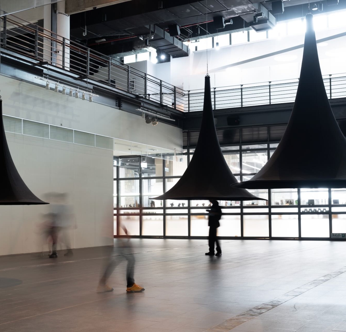 王仲堃的作品《体2025》懸吊在國立臺灣美術館(以下簡稱「國美館」)入口大廳中央,為一以銀白細鋼架構成的幾何球狀體,其上延伸出多個以純白紙質捲成的話筒。作品透過感測器偵測展場中細膩的氣流,並以聲音和光線回應環境所帶來的變化,這件作品不僅將我們皮膚所感受到的數值,轉以視覺和聲音的方式呈現,更數倍放大我們感官原本所能感知的狀態。而同樣也在一樓大廳後側,孫瑋的《聲寺》懸吊數個大型的黑色流線型喇叭造型雕塑,在其中播放廟宇的環境聲響,形塑一種被聲音包圍的沉浸空間,並將公共空間轉化為半私密的聆聽體驗。如此透過作品來轉接聽覺、視覺、甚至是觀者的身體感,可以說是討論這次國美館與法國龐畢度中心(Centre Pompidou)共同策劃的「無序樂章:聲音藝術之旅」的一個不可忽視的閱讀路徑。