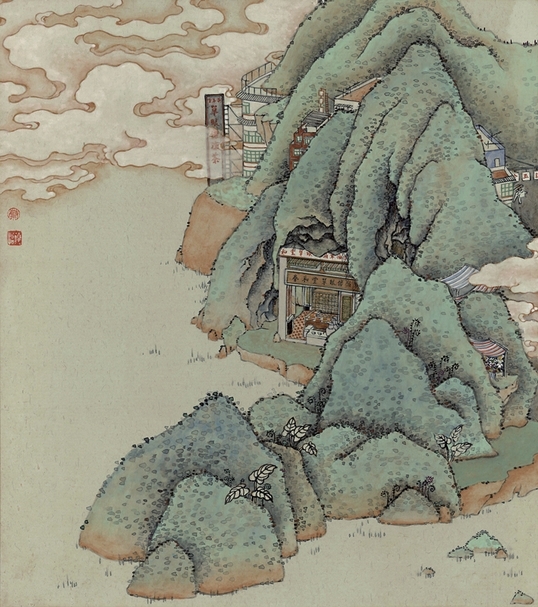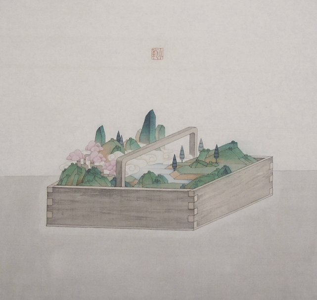 蔡德怡巧妙地在青綠山水穿插香港地道景致,畢業後首個個展就把著名的旺角金魚街店舖繪進山水裡面,記錄消失中的城市痕跡。今次展出的「佐敦」系列收集了一些佐敦區懷舊小店及食肆,繼續以畫筆重構香港人的集體回憶。另一方面,張小黎則以青綠山水寄喻自身的思緒際遇。她臨摹古畫時有感於機械化的造景堆砌過程,於是把山樹化成樂高(LEGO)積木,創作了「樂高山水」系列。畢業後到北京打拼卻踫上每年工作室被迫遷,奔波流離的「北漂」生活啟發她構思了「盒子山水」系列─植物都只能生長在盒子容器之中,不能落地生根。她以現代繪畫語言透過山水抒發情感,其實與古代文人,以畫載道一脈相承。