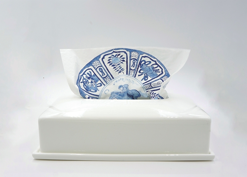 而剛畢業於北京中央美術學院實驗藝術學院碩士課程的許開嬌,則嘗試以工筆結合當代物件。她在紙巾、廁紙上繪上青花圖案,把廉價平常物轉化為高貴藝術品,再於花紋上滲以當代元素構成隱喻。如展出的一張紙巾繪有跑馬圖像,在香港回歸20周年之際反思小島政治仍否「馬照跑」。