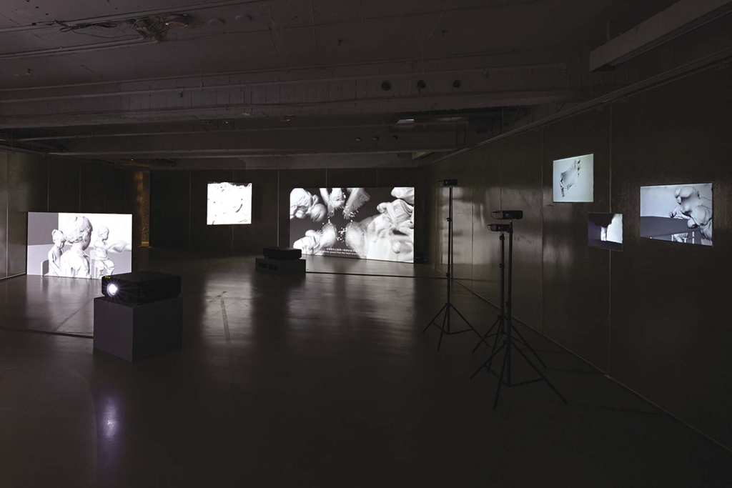 在洪建全基金會的展場中,這次的「災變論—許哲瑜個展」由多頻道錄像組成,冷調色溫的影像在黑盒子中營造出法醫建築的冷峻氛圍。展覽入口擺放著單腿、單手雕塑,其截斷的身體形態與螢幕中播放的兒童傳遞單腿掃描動畫形成互文呼應。右手方向的牆面則投射著兒童身體的3D掃描影像,白色石膏般的數位材質讓人聯想到古典雕塑與當代法醫學的奇異結合。這些實體物件在空間中成為暗黑啟蒙學的物質索引,與虛構敘事呼應,引領觀者逐漸沉浸於駱以軍《匡超人》與尼克.蘭德災變論的敘事結構。