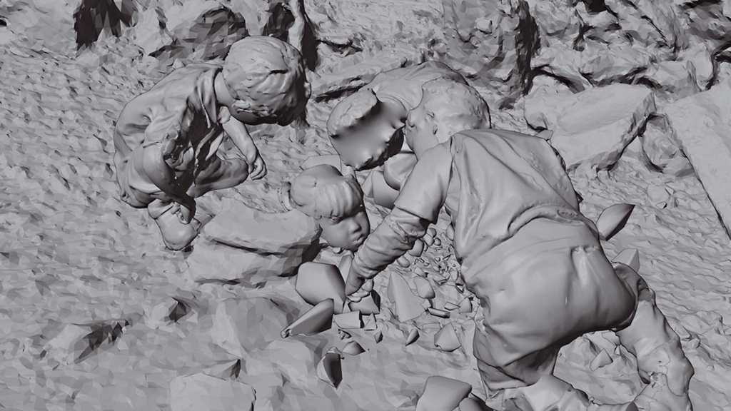 許哲瑜與陳琬尹透過3D掃描和虛擬實境技術,對巴勒斯坦兒童影像進行數位重建,這不僅是藝術歷程上技術層面的創新,更是對傳統人道主義敘事框架的根本性挑戰。《災變論》中的數位身體正體現了這種「技術奇點」的三重特性:接受災難兒童的原始形式、賦予其新的數位存在模式,並透過批判性重構摧毀傳統人道主義的敘事框架。這種技術介入使得災難不再是偶發事件,而是具有加速性質的系譜提問。