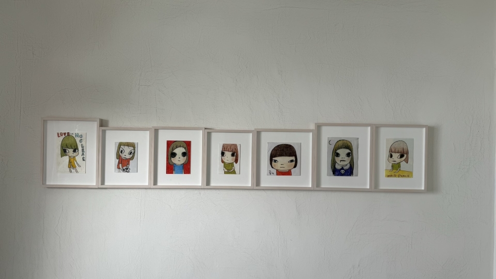 自高雄內惟藝術中心啟程,畫作相繼現身澎湖、屏東,如今抵達金瓜石,在山海雲霧交織的環境中開啟新的篇章,也為這趟長達十年的藝術旅程增添獨特的一站。展場原為台電員工宿舍的未完工建築,牆面仍保留斑駁油漆與歲月痕跡。奈良特意要求暫停部分整修,維持空間的「未完成」狀態,使作品與場域在歷史與當代之間展開對話。山腰間的地理位置,環繞著雲霧與潮濕氣息,也讓金瓜石的自然氛圍成為展覽的隱形敘事背景。