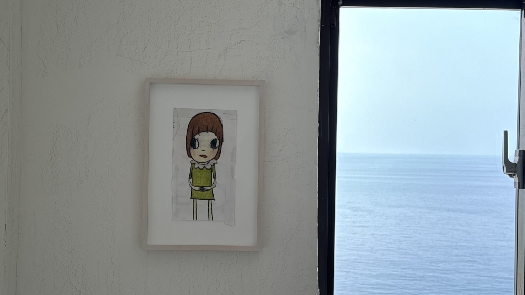 台電金水基地承載礦業時代的集體記憶與在地故事,粗糙的牆面與斑駁痕跡,與奈良美智早期帶有手稿質感的作品相互呼應。觀眾在欣賞畫作的同時,窗外海天交界的景色與空間的歷史感交織,讓人同時感受到衝突與平靜。這種跨越時空的並置,不僅豐富了觀展層次,也深化了作品與場域的對話。
