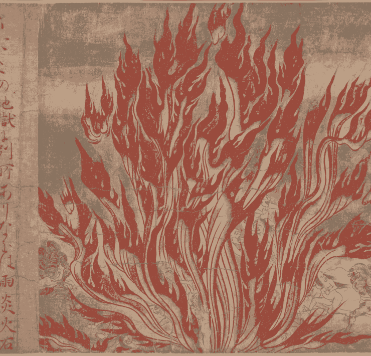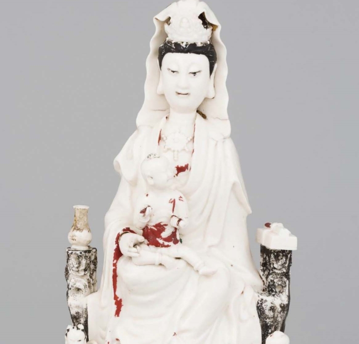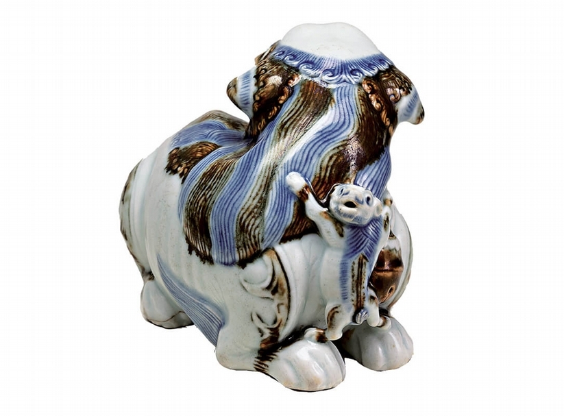 海駝是傳說中維護正義的神獸。白瓷的釉色略微泛青,屬於分院窯全盛期的釉色。海駝的大眼大鼻、猙獰的獠牙和舌頭,多少給人恐怖的印象,但是脖子上繫著鈴鐺,如幼獸一般玩耍嬉鬧的模樣又讓人不禁微笑。小海駝的嘴巴是出水孔。青花和鐵繪巧妙的搭配,使本作更具裝飾性。傳說海駝棲息於水中,會將大量的水吞進腹中再吐出,和與水相關的水滴相當合適。本作不僅尺寸大於其他海駝型水滴,造型表現也極為卓越。(圖為正側面)