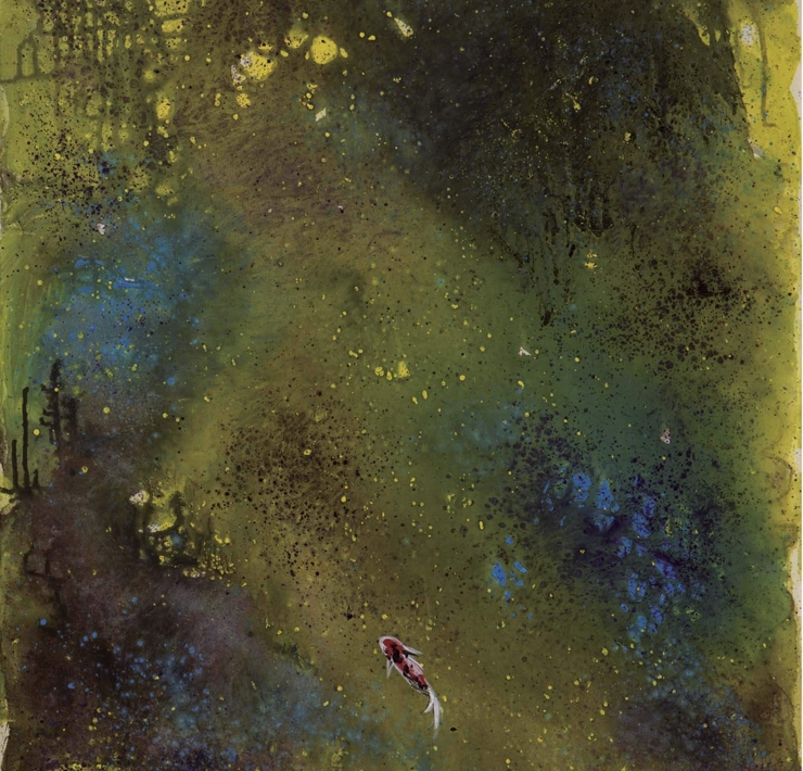 黃色斑點狀顏料宛如星雲碎裂後的殘光,亦可能對應詩中「銀河落九天」之意象。水與光的概念在此被重新物質化,轉化為顏料的具象擴散與堆疊。作品無任何重心或明確景深,視覺運行呈現漫遊式的空間感。