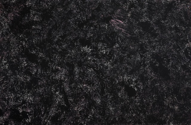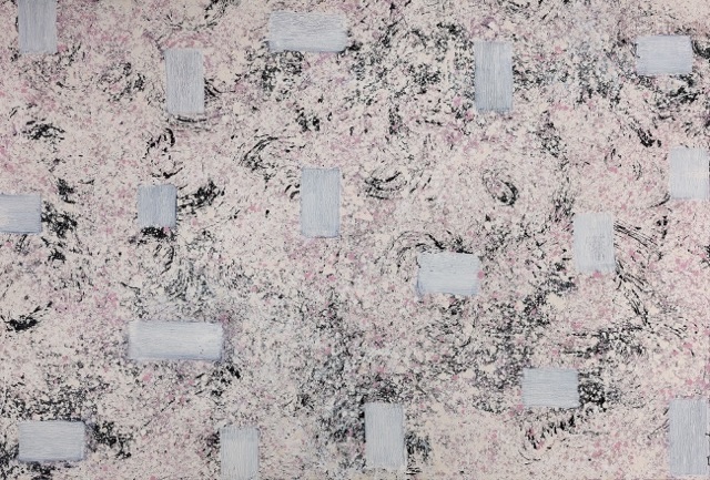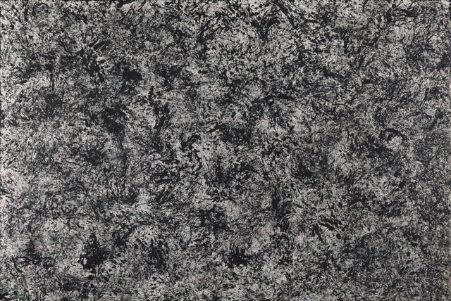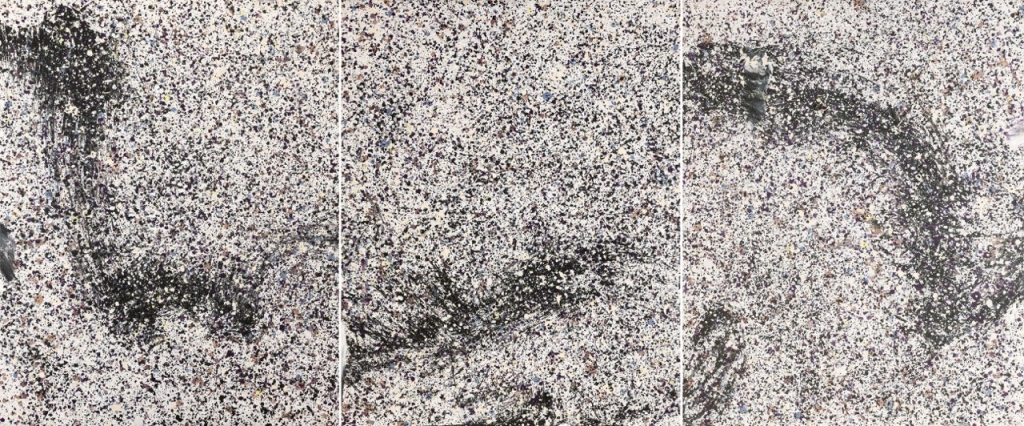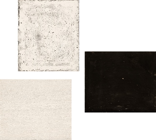 作品中,左上方的畫布在淺灰白基底上,佈滿細碎的墨點與筆觸,構成宛若渦旋般的紋理及律動;濃重邊緣的墨色與隱約聚集點線的畫面中心,共同描摹出猶如雲霧間掃過竹、葦的清淺殘影,亦仿佛歲月侵蝕後的拓印餘痕。中間的畫布以近乎純墨色帶出厚重深邃的質感,重墨表層下,隱約可見細微紋理與刮痕。這不禁讓人聯想起馬勒維奇(Kazimir Malevich)《黑色方塊》(Black Square)中湧動的力量與生命感,但有別於馬勒維奇對物理學黑體輻射的純粹想像,這墨色中的紋理與刮痕,更留存了書法疾書時無意間的飛白,從而連結了書家以身姿精神貫注於筆尖的動勢。左下方畫布則以米白為底,滿布細線般的裂紋或波紋,在規律與隨機間呈現出輕盈寧靜的平衡。
