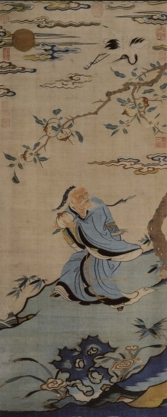 《石渠寶笈》共著錄有三幅「宋緙絲蟠桃獻壽圖軸」,此件為《石渠寶笈三編》藏於「乾清宮」者。據公開資料,目前各大博物館尚無一家收藏有此三件緙絲中的任何一件,足見其珍罕程度。此幅蟠桃獻壽圖熟練運用平緙、勾緙、摜緙、結、長短戧和包心戧和合色線等多種技法,運用多色絲緙織而成。根據不同的物象,選用適宜的絲線,緙技極為精巧,配色和諧,層次分明,形態準確,生動傳神。北京故宮博物院宮廷部織繡組研究員嚴勇在細密的研究後表示:「考察其緙織技法特點和藝術風格等方面,與宋代緙絲並不完全符合,而更多呈現出的是較為典型的元代緙絲特徵。」「據統計,現存的元代傳世緙絲作品,台北故宮博物院藏四件,遼寧省博物館藏二件,北京故宮博物院和紐約大都會博物館也僅藏數件。元代之前和之後的緙絲作品則相對較多,如台北故宮博物院藏宋作70件(當然其中部分作品的年代有待考證和商榷,或為元、明),明作32件;遼寧省博物館藏宋作十件,明作12件……正是由於當今元代緙絲作品存世的稀有,在很大程度上決定了元代緙絲作品的珍貴價值。這件緙絲〈蟠桃獻壽圖〉軸藝術水準上佳,對於研究承前啟後的元代的緙絲藝術具有重要價值,並其曾入藏清宮,經《石渠寶笈》著錄,鈐乾隆、嘉慶皇帝的鑑藏璽多枚,為皇室所寶重,流傳有緒,更是彌足珍貴,引人矚目。」