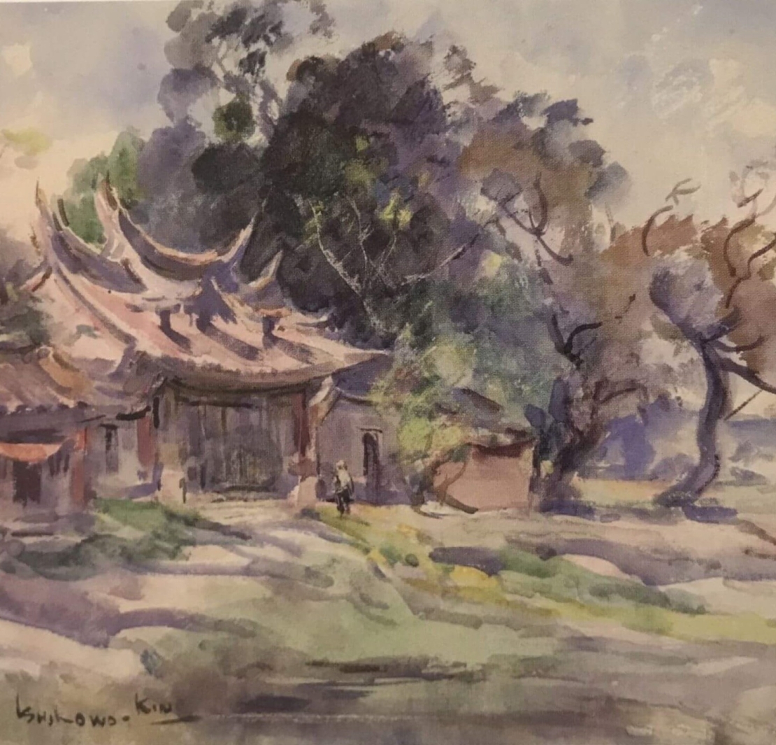 1907年石川欽一郎來到臺灣,彼時臺灣神社已落成近七年。在石川水彩筆下的《劍潭寺》,前殿正處於1918年匠師陳應彬開始動工前懸山頂的樸實模樣。(註14)因此可以推斷石川描繪的劍潭寺,應取景於來臺後1907至1918年之間。畫面中他不但把劍潭一併收入,同時將右側畫面聚焦於臨岸的巨樹,彷彿呼應著劍潭傳奇中,荷蘭人把寶劍藏入茄冬樹的傳說。