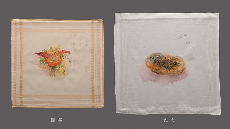 「手絹」系列復刻了申亮的童年回憶,年幼時每當母親下班回家,他就去翻找母親放在皮包裡的手絹,裡頭總是包著一些帶給他的小點心。2011年他開始在手絹上描繪食物,將一直掐在手心裡的情感攤開,後來又發展出「國宴與民食」系列,藝術家走入庖廚畫出一疊食譜。樸素的白手絹上畫著烙餅等庶民點心,加註寥寥幾句製作材料,例如地溝油和毒澱粉等,或僅僅畫了一團餅兩塊錢,便宜得沒什麼好說。與之對比的是彩絹上的國宴,字斟句酌的菜名挑動味蕾,而盤中佳餚拳頭大的份量與史詩般的食材清單及料理工序不成比例。另一方面,有時國宴餐桌上的美食並非重點,重點在於檯面下運籌帷幄的政治。作品影射了朱門酒肉臭而路有食安隱憂乃至生命危險,從個人經驗反諷國家形象與社會問題。