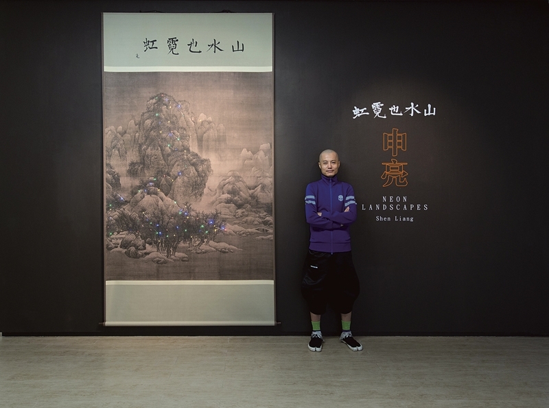 藝術家申亮與作品《山水也霓虹》.丙烯、霓虹燈、數位印刷、紙.290×160 cm.2016。圖|大未來林舍畫廊.台北