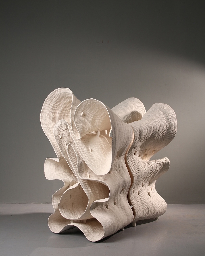 美國著名建築師路易斯.康(Louis Kahn, 1901-1974)曾經針對磚塊作為建築的最基礎構件,如何盡其材質之能,以臻極致之用,提出詩意的反芻。追求形體極大與極薄的徐永旭,除了全身性的動員,亦須試煉材料的物質極限。陶瓷在窯燒之前,先以溼軟的黏土狀態存在;其體量與結構不僅受材質自身的物理性及重力所致的雙重應力牽制,更可能在超過攝氏1,200度的燒製過程中,充滿不確定的變數。因此,他得先確認黏土在雕塑階段,已經解決應力的問題,才不至於因為極度高溫的熱流振盪,導致結構崩塌。再者,為求充分掌控陶瓷的燒成條件,儘可能消泯不確定因素,以確保良率,他還需要更多的科學理性。從陶土/瓷土的揀選、窯爐的規格、作品的進出、瓦斯火焰的勻稱度,以至窯溫的恆定性等各種設計,徐永旭最終完成了一套獨門的建窯與燒製技術。