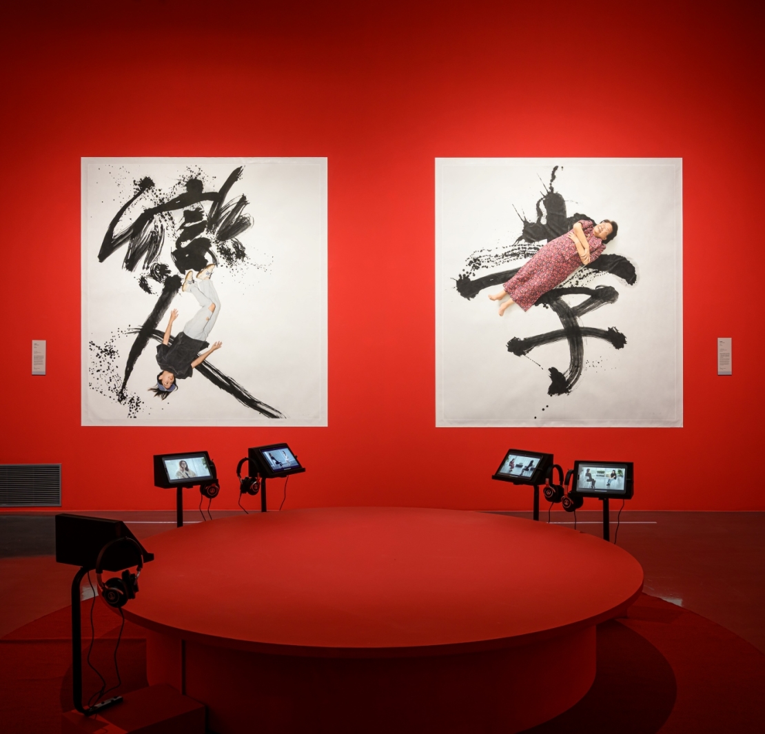 日本書藝家川尾朋子的《HITOMOJI Project-Women-》是一項結合書寫、攝影與社會參與的跨國計畫。她親自採訪數名臺灣女性,從她們的生命故事中提煉出一個代表性漢字,例如「變」、「孝」、「做」、「努」、「幸」。在展出攝影作品中,將女性們或蜷曲、或伸展的身體姿態,巧妙地融入巨大漢字的結構之中。女性的身體化為筆劃,姿態即是墨韻。文字於是掙脫了符號的扁平框架,昇華為承載著體溫與真實敘事的生命載體,成就一場「由文字與身體交織而成的書寫旅程」。