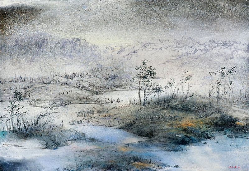 4、米氏筆意山水與雪景:初期在嘗試潑墨山水表現,腦海浮現宋元山水的畫面,因此在潑墨底後以工筆筆法完成了這系列作品,像是「筆意山水」、「迷濛山水憶故人」……等。不知有如此巧合,就在年初的一場雪讓亞熱帶的平地有了雪景的真實,以灰階處理樹梢上的點點白雪,「年初的一場雪」「瑞雪」系列雪景與米氏筆意的系列山水在不同時空間對話。