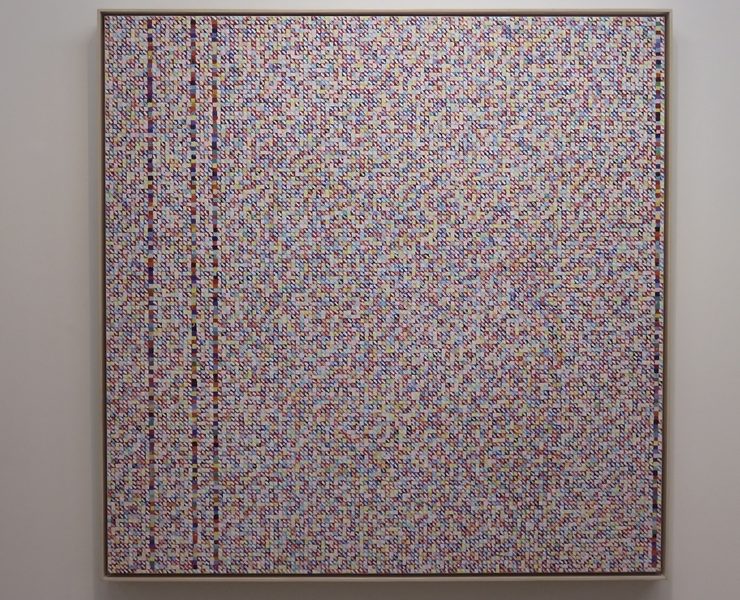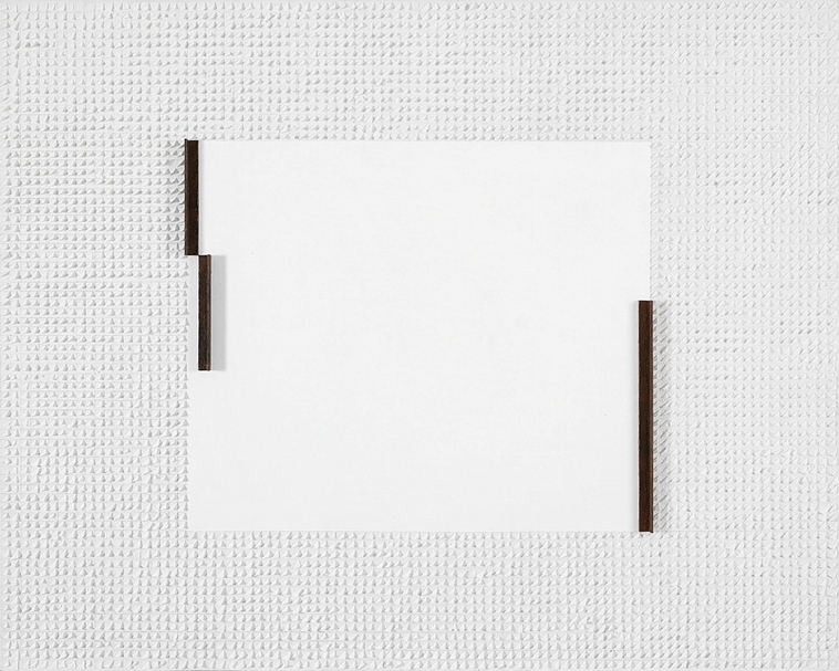 另一方面,莊普印記手法的創作迎來了全白色彩的新系列,簡化至垂直和水平構成的方形格線,令人更清晰地得以上溯在20世紀現代藝術中,無論是馬勒維奇(Kazimir Malevich)或蒙德里安(Piet Cornelies Mondrian)等人作品中,根據四邊形、三角形及圓形等基本幾何形狀而來的無限造形建構。其次,他在方格中以刀片割劃斜線,強化出了「摺」這一個細微動作所帶來的多度空間維度之可能性,也讓觀者在步移之間,翻起的紙片因為受光和背光所造成的光影效應,創造猶如歐普藝術(OP Art)讓色彩漸變的視覺效果。