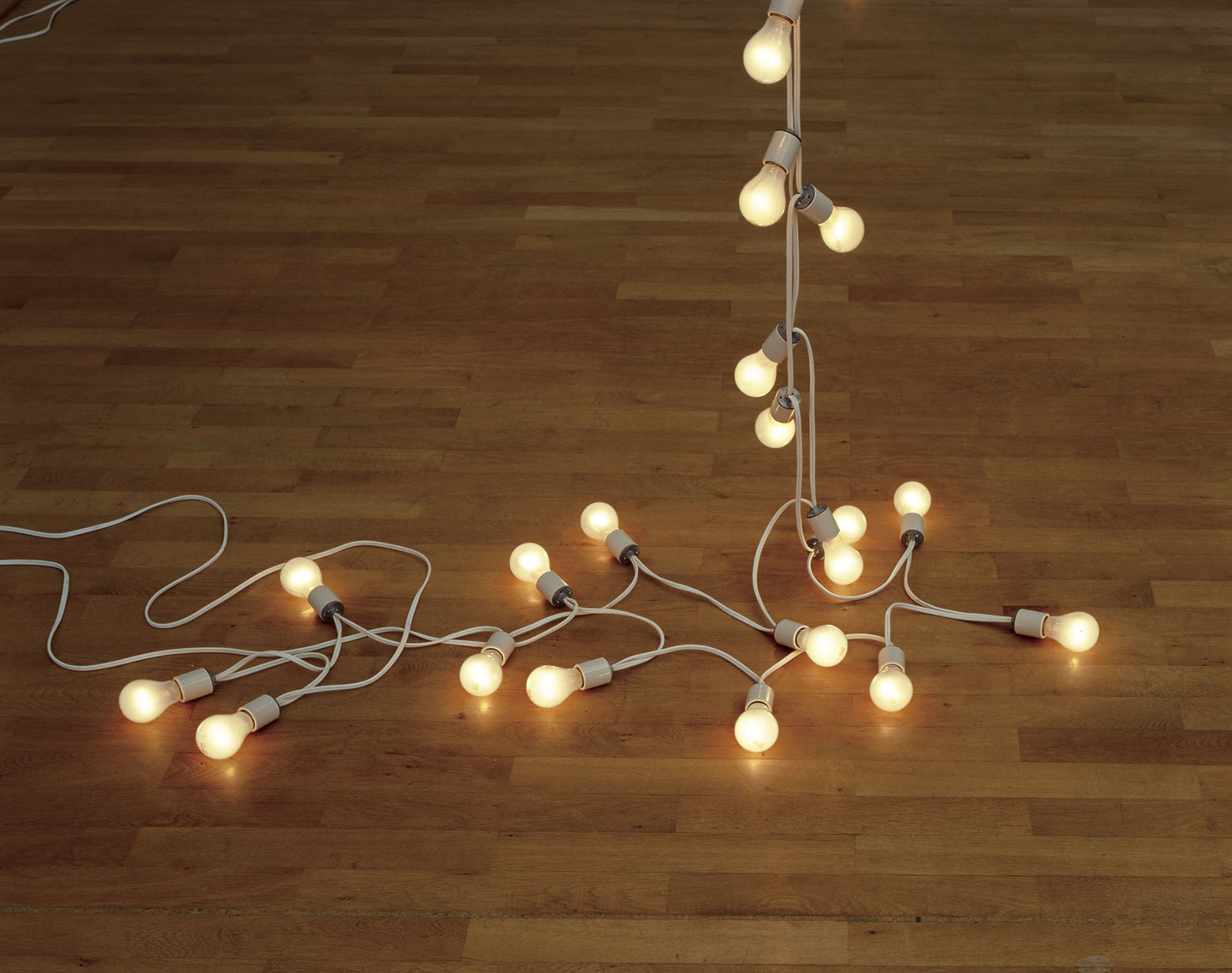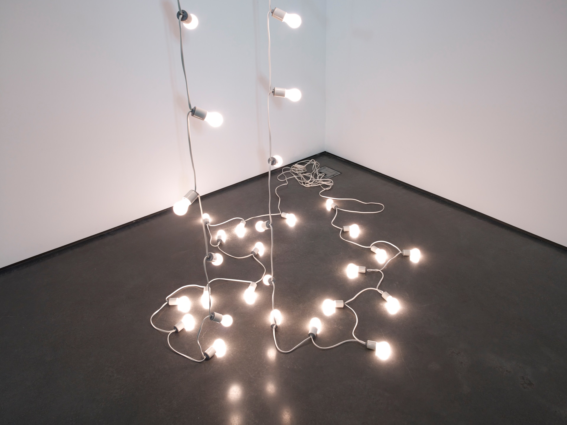 循此脈絡,這兩系列作品也同時在質疑「獨一無二性」的迷思。絕大多數被視為獨一無二的燈串作品,其起始點都刻意使用完全相同的媒材:相同數量的燈泡、相同長度的電線……。然而,除了它們在同一時間只能存在於一地的規則外,正是「所有者或授權借用人有權決定作品的裝置方式」這一點,才使得每件作品得以被視為是充滿個性且獨一無二的。到這裡,這如何成為一個關於「個體」的隱喻,也就不言自明了。