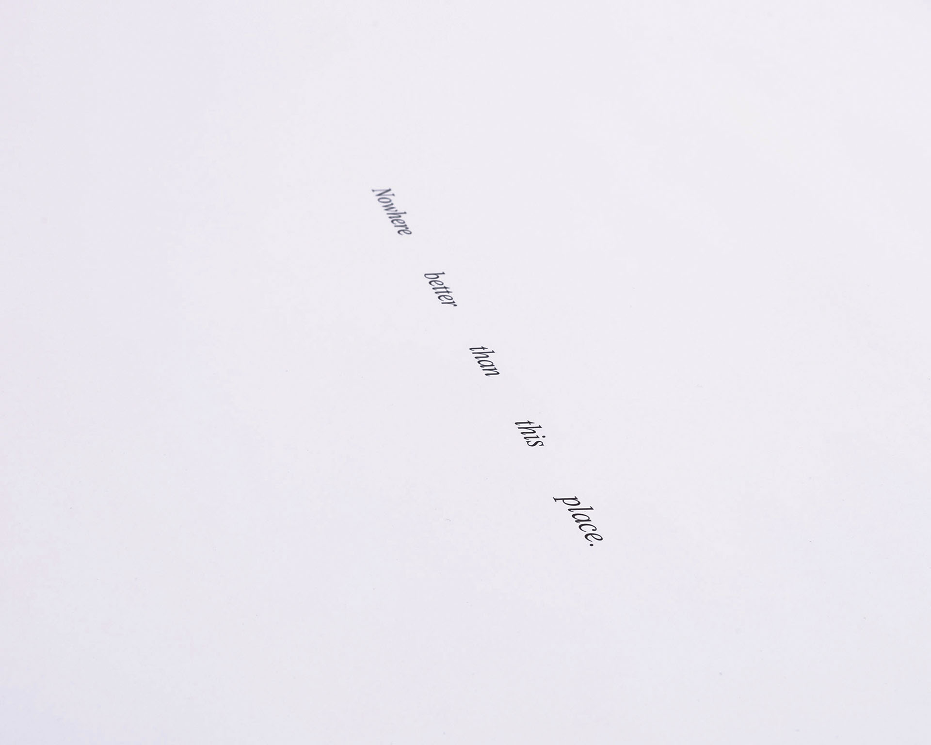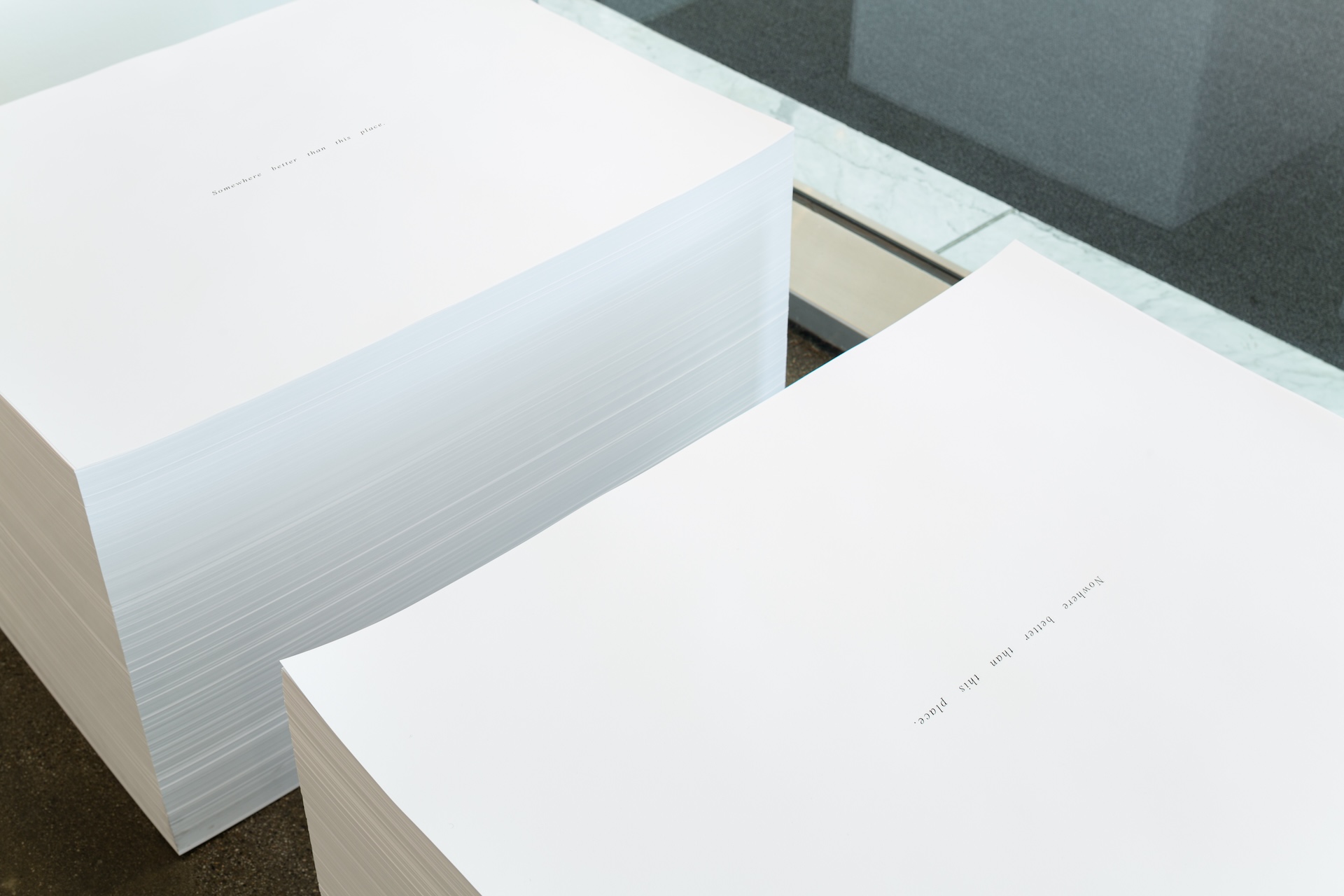 兩疊紙堆分別印上了兩句看似矛盾的話:「Somewhere better than this place」(別處勝此處)與「Nowhere better than this place」(無處勝此處)。這組句子製造了一種深刻的歧義性:它既暗示著對另一種現實的渴望,也同時肯定了當下即是唯一。這使其與《「無題」(完美戀人)》的時鐘形成了巧妙的平行:時鐘是時間流逝的同步見證,而紙堆則是這份關於愛與失落、在場與缺席的見證中,可被觸摸與帶走的拓本。觀眾取走一張紙,就如同帶走了一份記憶的實體,讓私密的紀念得以進入公共的流通。