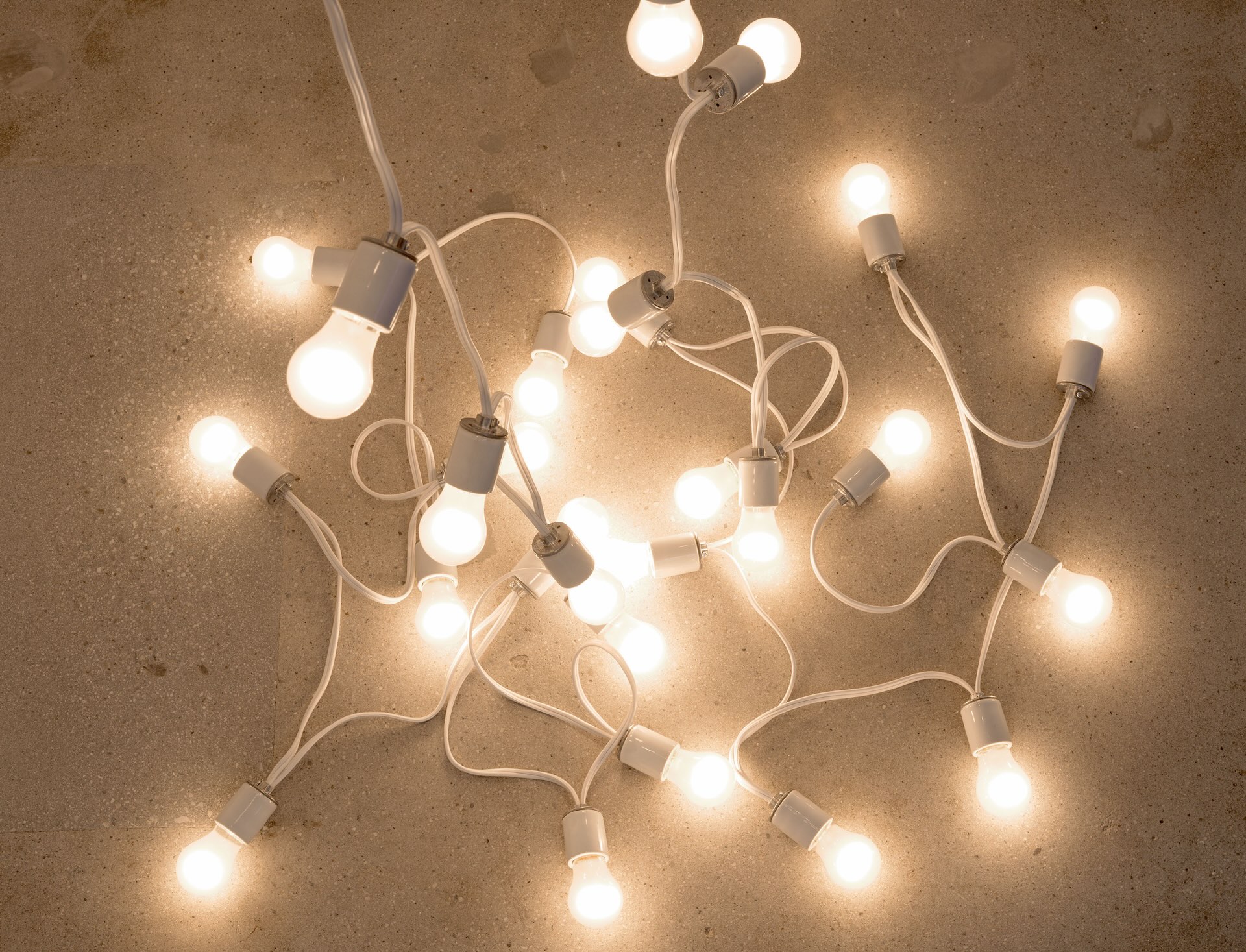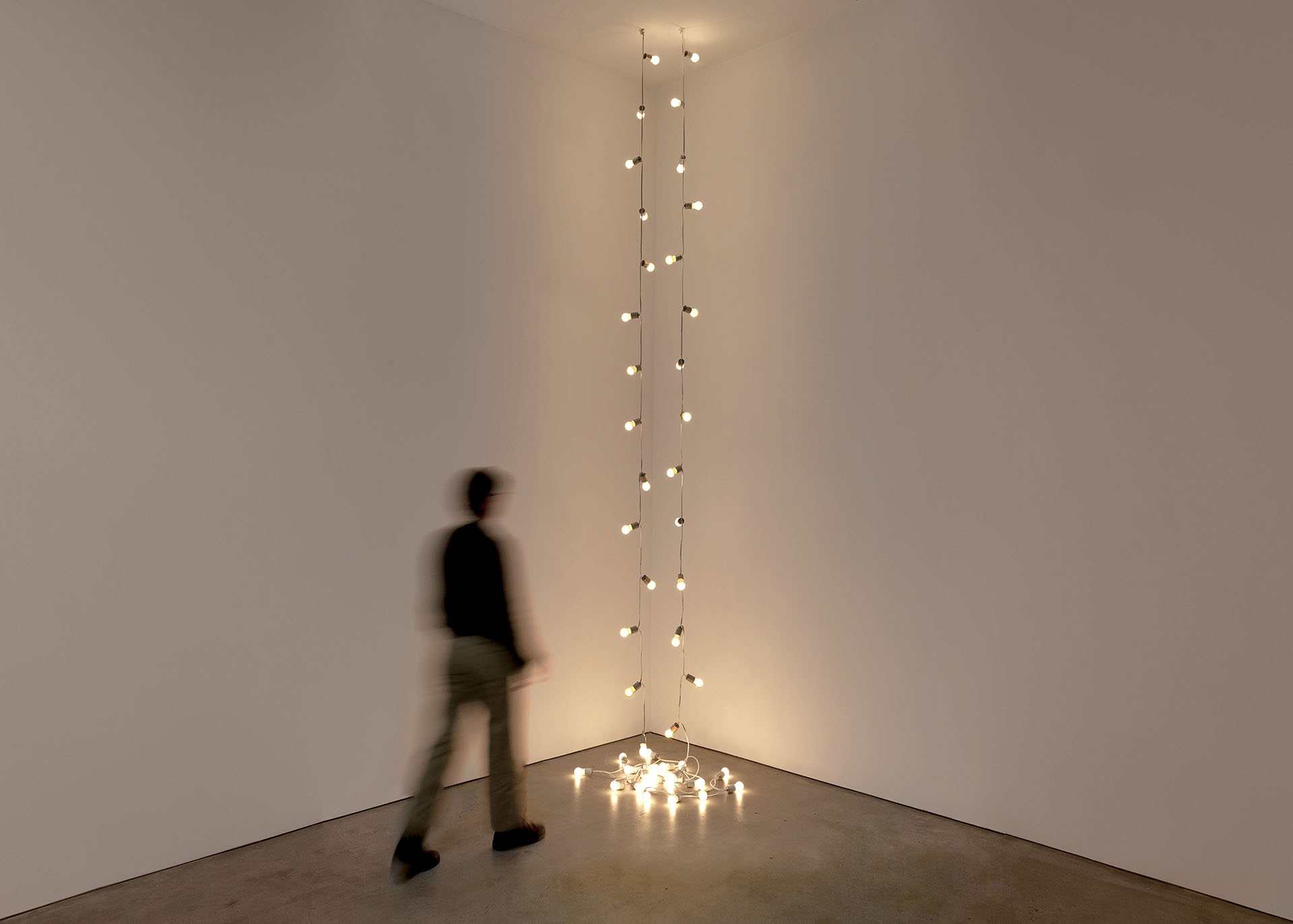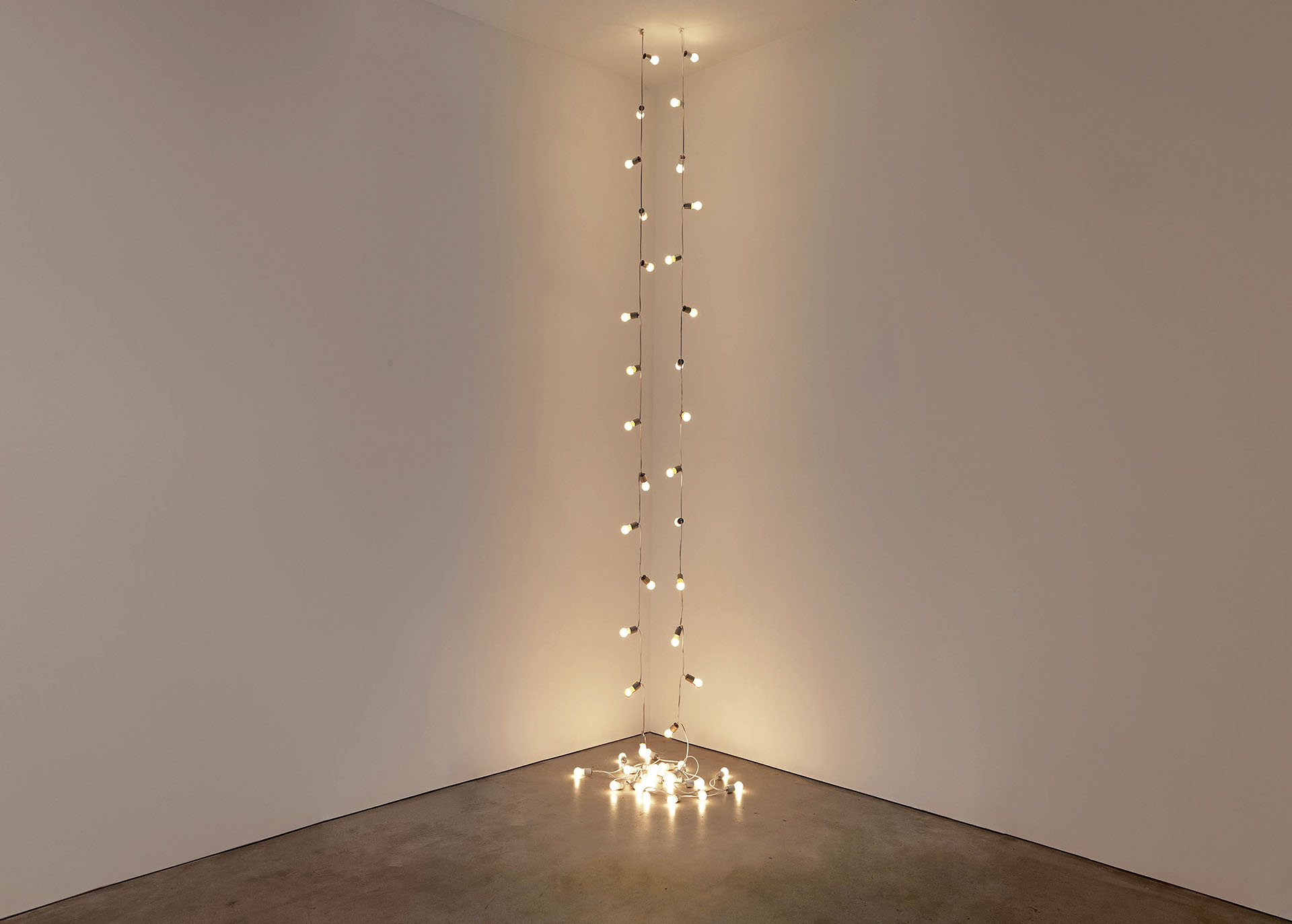 他的燈泡串系列,則以光的形式書寫陪伴與無常。兩條交織的電線,數十顆燈泡散發著溫暖的光暈,照亮展場的一角。它們是如此美麗,卻也如此脆弱。燈泡總有燒壞的一天,需要被替換。這份溫暖,始終伴隨著即將逝去的陰影,完美地隱喻了生命中那些閃亮卻短暫的片刻,以及我們為了維繫這份光亮所付出的努力。