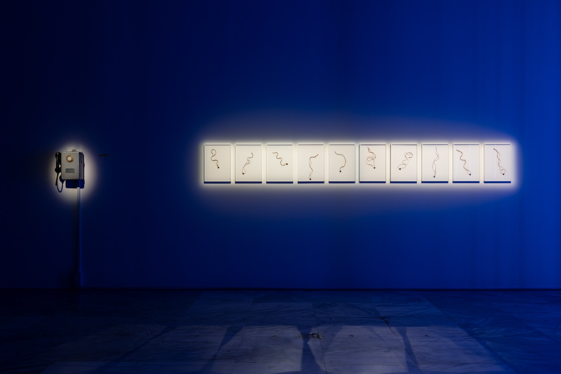 她期待素昧平生的觀展民眾有機會因為此裝置而相識,以此開啟一段友誼甚至戀情,在構思此系列時,她也曾想像過將電話裝設在不同城市,甚至是不同國家,拉大距離與文化的跨度;另一方面,地下室的展間呈現了十幅「繫線硬幣」,原來當時秘密通話的人們在掛斷電話後,只要投幣時記得使用這樣的巧妙設置,就能夠將剛才投入的硬幣拉回,「上有政策,下有對策」,與政府鬥智,不僅象徵性地奪回了「言論自由的代價」,此舉更是蘇聯治下人民渴望自由聯繫溝通、暢所欲言的最佳佐證。(文/陳賦)