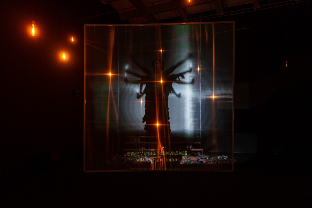 阿讓諾度才透過影像、聲音與空間的整合,試圖探問:「悲痛能否被轉化?」而作品核暗示著「愛在消逝之後仍持續存在的形狀」。正如神話中的猴子將灰燼化為黃金,哀悼的過程也能將悲痛轉化為更有意義的記憶。這件沉浸式的錄像裝置,巧妙地利用光、影、透明與實體物件,試圖在科技與古老信仰的交織中,重塑了對於死亡、愛與記憶的理解。(文/李京樺)
