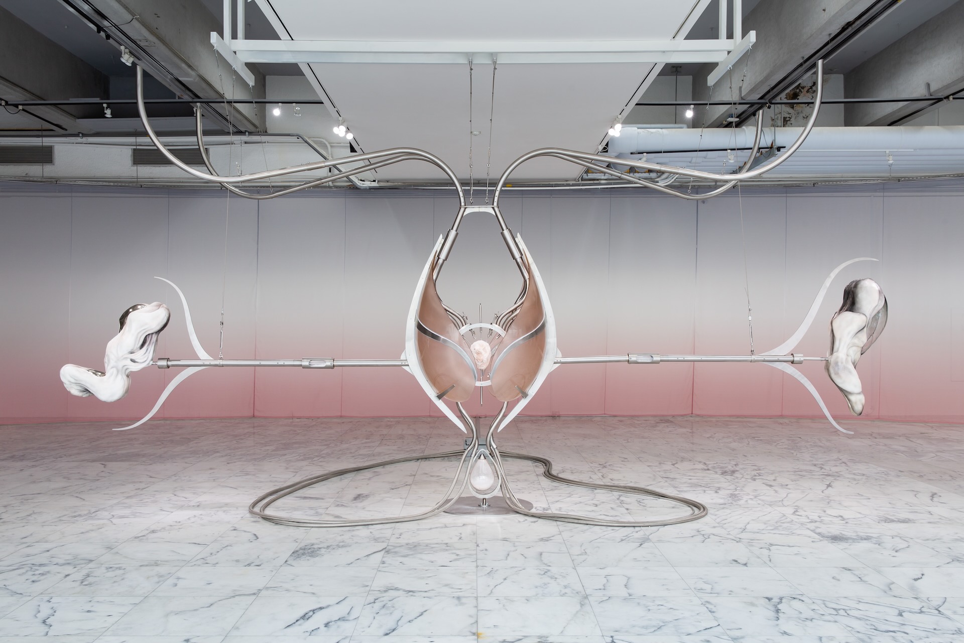 現居紐約的塞爾維亞藝術家伊凡娜・巴希奇(Ivana Bašić)在本屆北雙現場有三件裝置作品,其中兩件較大型的複合裝置,《氣動激情》與位於戶外中庭的《靈變》之間隔著一整面玻璃牆,宛若隔開兩個互相映射的世界。媒材對她而言皆具深意,如玻璃代表呼吸,蠟代表肉體,金屬喚起對生命意志的感知,石頭則一如《氣動激情》正中那顆在金屬錘擊之下不斷朝向消解的「心臟」,為承載歷史的壓力、吐納著消逝與再生之氣息的物質,甚至「氣息」也被列入作品媒材,扮演著充滿力量的角色。