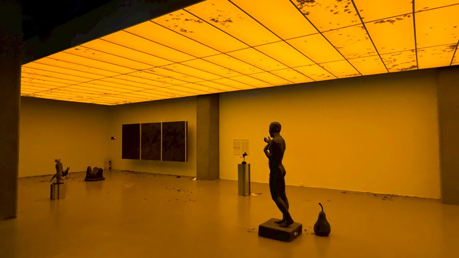 阿瓦羅・烏爾巴諾(Álvaro Urbano)的作品《活畫(失竊的太陽)》,在台北雙年展中構築一個模糊現實與夢境邊界的劇場空間,透過光影的變幻與物件的詩意並置,展開一場對渴望和歷史的「考古」。裝置中心閃爍著澄黃光芒的天花板燈,其光線宛如陽光色彩:時如白晝明亮,時轉夕陽餘燼,燈滅又如日落昏黃。光板內散落著樹葉,偶見蝴蝶徒勞振翅掙扎的剪影。這盞燈光籠罩著下方,除了佈滿的金屬樹葉,現場擺放的雕塑與繪畫,皆是烏爾巴諾精心挑選的北美館典藏品,被卸下歷史包袱,賦予新的角色與敘事,共同演繹光影劇場。