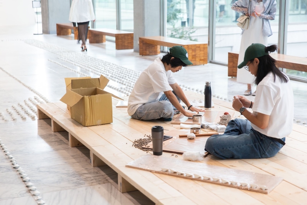 與此同時,這些「餅乾」在風乾黏土乾燥後硬若瓷器,唯有毀壞這件藝術品,才能滿足得到其中的種子、並獲取籤文訊息的渴望。本屆北雙結束前,觀眾將會被正式告知可帶走這些「幸運餅乾」。這一設計在獲取資訊的渴望與犧牲審美的挫敗感之間製造張力,在觀看者與現場進行著「重複勞動」的製作者之間搭建起另一層連動,在這一將時間的流逝、明確的渴求等具象化為一個個「幸運餅乾」的「小型私密工廠」,藝術家深深植入對於理解人之境況的渴望。(文/嚴瀟瀟)