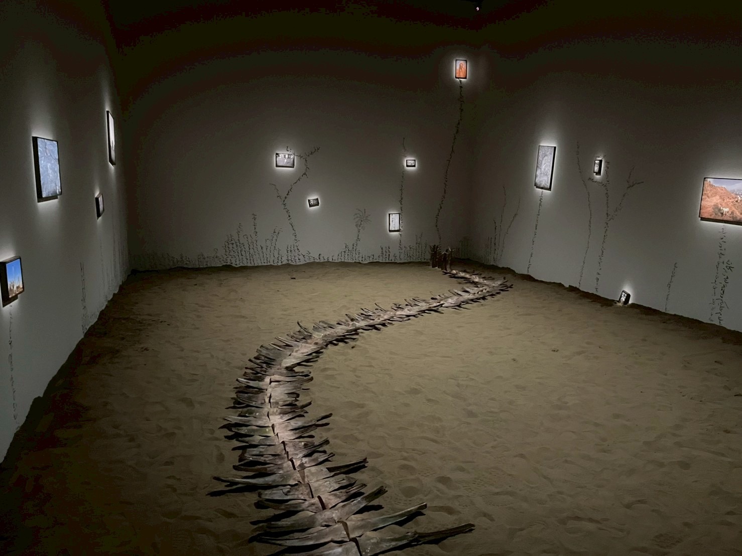 展間中央,一組以乾枯棕櫚排列而成的雕塑宛如一節脊椎,輕輕托起地面。棕櫚樹在生命末尾會因水分流失而變得脆弱、乾裂,但它的纖維仍能被用以支撐、捆綁與連結,意指終將消逝的,也會以另一種方式回到大地。