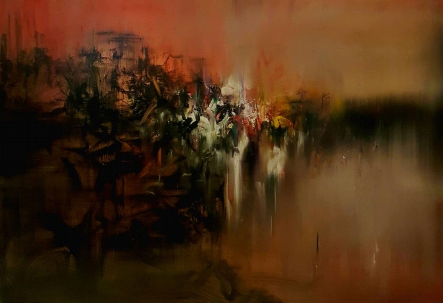 承東方寫意的抽象內涵,加上自身所經歷的深厚積澱,呂老師應用油彩的流動性與色彩交融的變化,進而拓展出幽美靜謐的畫面特色。如《暗戀》著重於深黯底色的閃爍光暈,垂直的筆觸帶動畫面的下墜與上浮,濃稠的橘紅底色,如同窗外朦朧的雨中夜景,畫作中,筆觸謹細柔美,不僅有東方書道的內斂含蓄,同時也加進個人特有技巧,各種色彩在深黯的底色下聚積,或揮灑或糾結,色點、色線、色面於創作下,架構出光與影的交和幻覺之美,引領觀眾進入深遠綿密的律動之中。