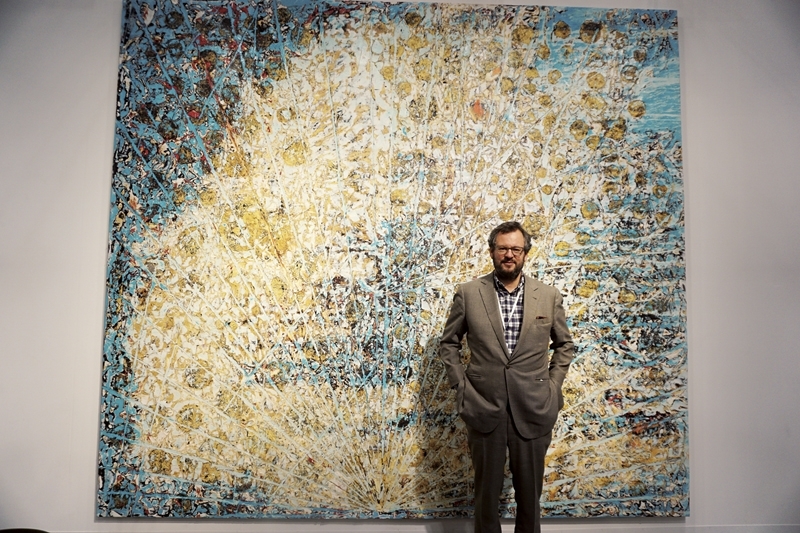 畫廊創辦人Iwan Wirth,於藝術家Mark Bradford 今年的新作《Water in the Ears Puts Guards at the Gates》前合影。(攝影/林亞偉)