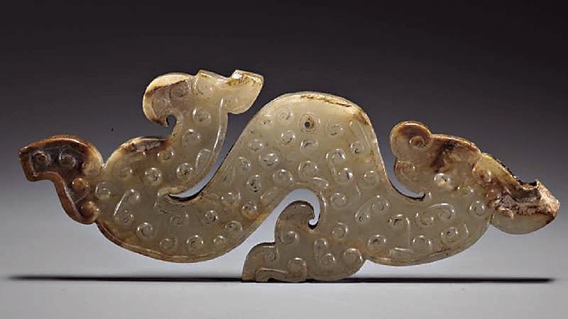 新石器時代所出土的玉器多為禮器,山西地區以清涼寺和陶寺墓地出土文物為主,有璧、琮、環、斧、鉞、璜等造形,可見當時的治玉工藝已相當精湛,能夠將玉石切割成城特定的形狀,並打磨出光滑的皮面,甚至鏤空、鑽孔,某些玉器上還留有線狀割痕,顯示當時已使用金屬片來鋸切玉石,而這些以高超技術製作的玉器,亦表明墓主有相當的財力和社會地位。及至商代和兩周,浮雕、透雕及圓雕等技法純熟,玉器的題材和使用範圍則更加廣泛。本次展出一只〈玉鹿配飾〉,回首跳躍的姿態生動,線條流暢,樹枝般的鹿角優雅挺立,並呈現類似圓雕的半立體效果,精緻可愛。