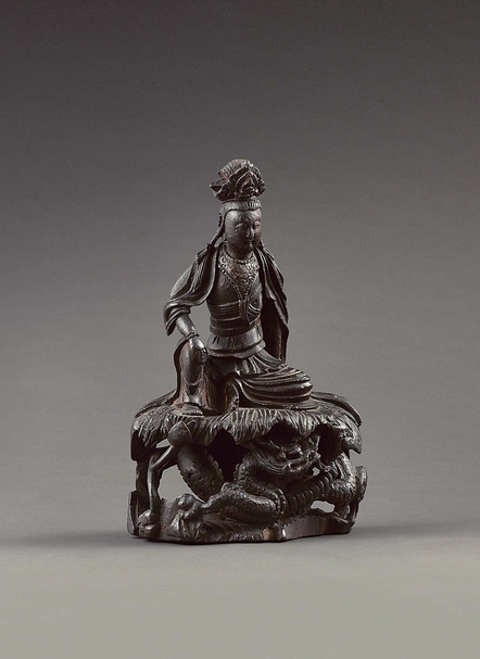 筆者有幸於1992年時首次拜訪位於倫敦的ESKENAZI,當時由徐政夫老師帶隊,一行台灣藏家共約15一同造訪。當時是首次造訪頂級的古董畫廊,感到無比喜悅與震撼,不論是畫廊的接待以及空間氛圍都讓人感到十分愉悅;震撼的則是一位古董商的專業達到如此的高度與廣度,舉目皆屬博物館級別的藏品。一晃眼已25年,筆者幾乎收集了全套ESKENAZI的展覽圖錄,每本皆仔細翻看,細讀再三,不但可作為研究的範例、收藏的標竿,也可賞心玩味,每每醉心於圖錄中許久。因是頂級的古董商,一直難以入手ESKENAZI的展品,有幸自拍場上拍得這尊元代木雕,證書顯示藏家於1993年購自ESKENAZI,終於一了心願。這件為典型山西造型,閒適自在觀音底下有龍盤旋,類似造型在石雕及三彩中也曾見過。木雕因流傳人間數百年,皮殼已油潤光亮,木材質地較硬,表面留有紅彩。自在觀音姿態流暢,盤龍造型生動,為一難得的明代木雕加彩自在觀音坐像。