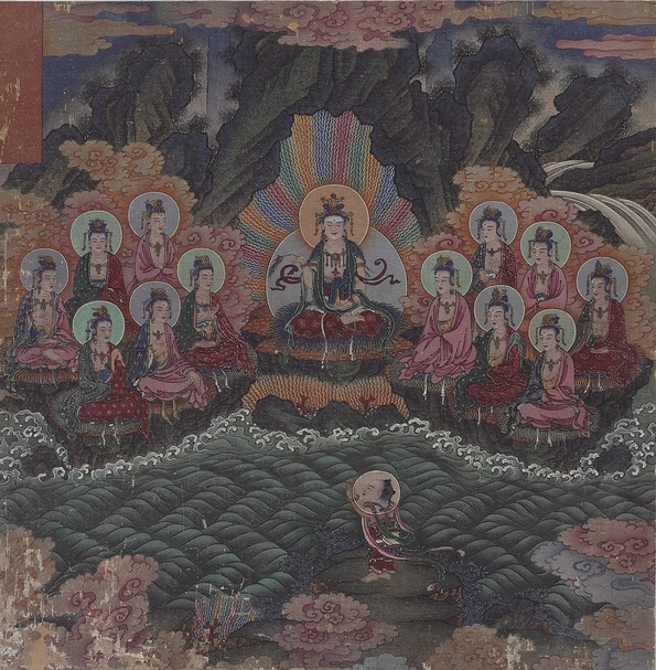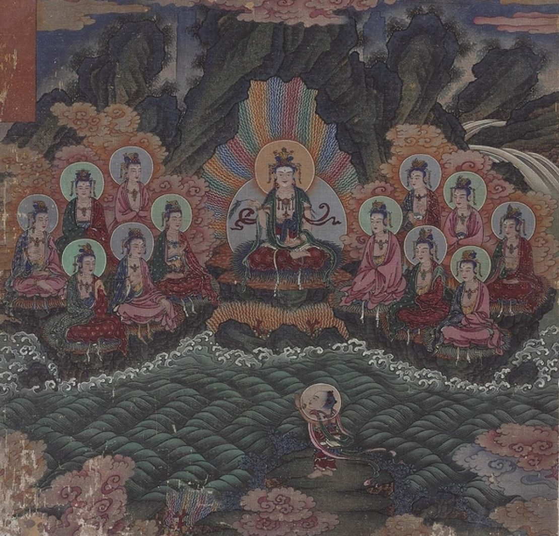 明代萬曆年間〈善財童子五十三參名冊頁:第二十八至補怛洛迦山參觀自在菩薩得大悲行解脫門之處〉,45×45公分。圖︱應真藏