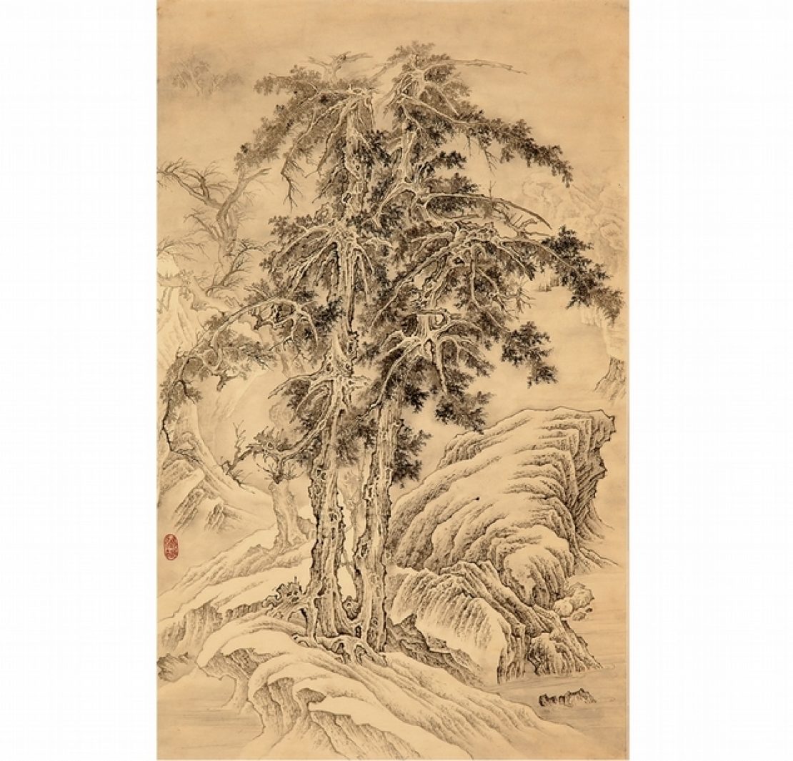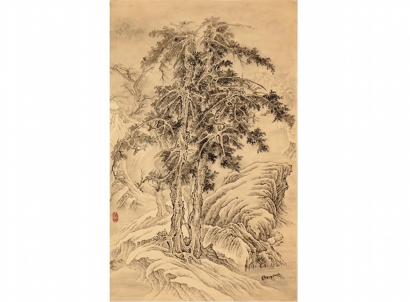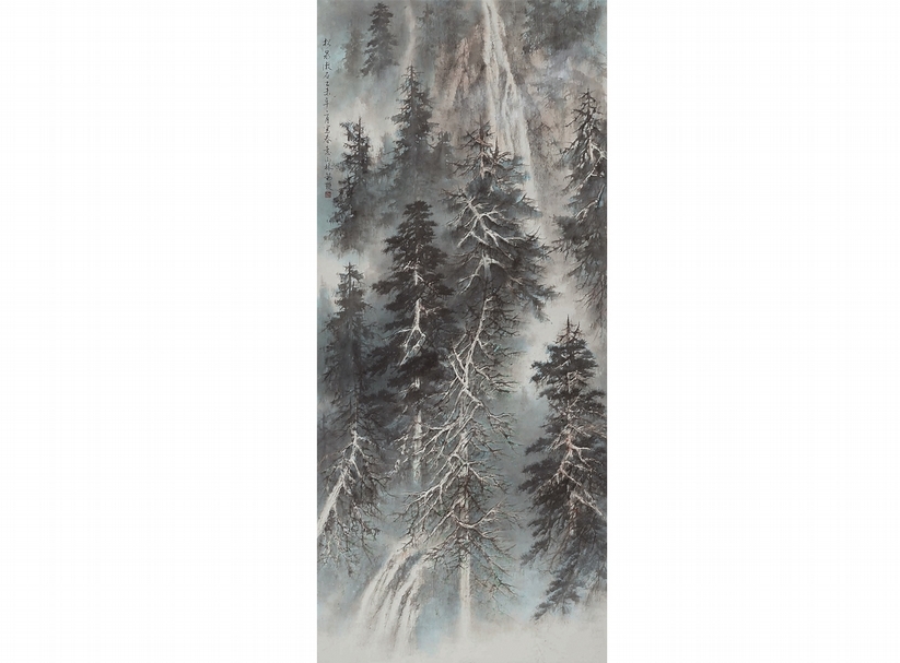 周錫珽1977年作〈仿北宋郭熙雙柏圖〉,98×60公分。圖︱周錫珽