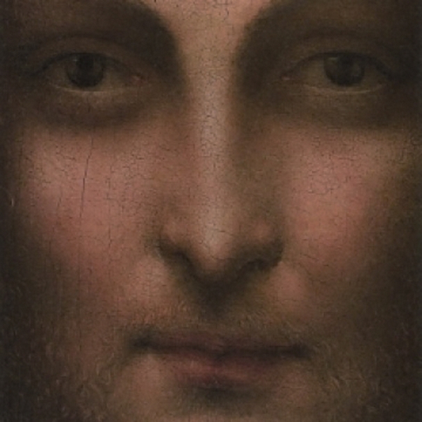 這幅《救世主》是畫在胡桃木板上,描繪穿著藍色衣袍的基督半身像,正面朝向觀者,舉起右手表現祝福的手勢,左手則捧著水晶球,表示拯救世人。