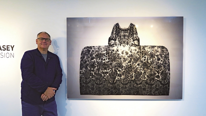 藝術家Nick Veasey與作品《Mantua Dress》合影。C-type Print.1682×1189mm.2017。Ed.1/9(攝影/楊椀茹)