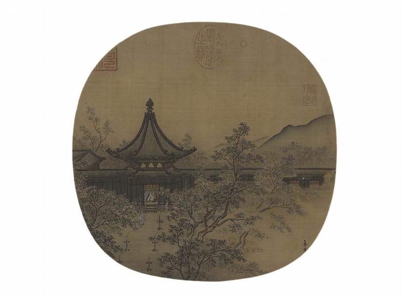 展品南宋馬麟〈秉燭夜遊圖冊〉(圖2)呈圓幅,畫面中央繪有一長廊建築,一人著素色長袍坐於屋中,屋外有護衛三四人。建築繪製細膩外,更以簡單數筆畫庭園中的繁花樹林,遠山以濃淡墨色暈染層次,屋內似有點燈,空氣中呈現迷濛之感,整個畫面一派和諧寧靜,表現出典型宋代自然主義的優雅特色。這件作品點出南宋時期園林的真實樣貌外,學者推測畫家應有取材北宋蘇軾〈海棠〉詩之意境。〈海棠〉詩原為蘇軾貶謫時期惜花、惜春又疼惜自己而作,然馬麟將詩意一轉,成了豪門貴族間精緻生活的浪漫縮影,畫面中多了分詩情畫意。是展同時展出馬麟之父馬遠的〈華燈侍宴圖軸〉。