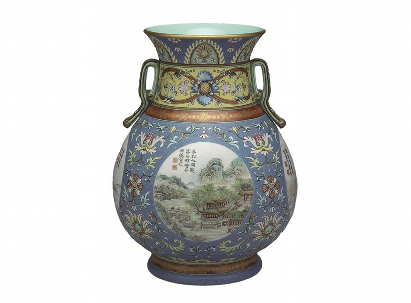 圖5 清乾隆〈洋彩瓷開光山水雙耳轉頸瓶〉,國立故宮博物院藏。圖︱國立故宮博物院