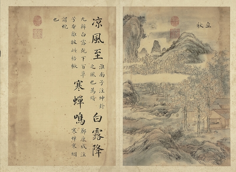 入畫的自然景觀,除山川勝景,季節景色亦為常見的題材。就像人四季穿著有異,春去秋來,大自然隨著四季變換也會妝點上不同的美景,此一單元即匯集了書畫、器物甚至是文字上的四季之景,如清張若靄〈畫墨妙珠林(卯)〉冊即為一例。〈畫墨妙珠林〉共有12冊,以地支號排序,每一冊有24開,每開皆為右畫左書的對幅,各63×42.5公分紙本,加裝裱紙每開為72.5×93.2公分。乾隆十年至十三年間,皇帝下令命12位宮廷畫家依12道畫題繪製此一套冊頁,內容包括有名勝山水、明君政績、孝子賢才等,張若靄所繪之〈畫墨妙珠林(卯)〉冊便是表現中國傳統季節之24節氣(圖4)。