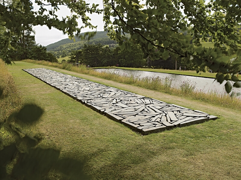 其實每年的「Beyond Limits」都是個銷售展。賣家委託蘇富比將作品在這美麗的環境中展出,再經由蘇富比從他們VIP客戶群中為這些雕塑找新家。這次所展出的作品估價從20萬美金至500萬美金之間。雖然說是銷售展,但今年比較特別,有三件作品是非賣品。其中一件是理查德.隆恩(Richard Long)的《Cornwall Slate Line》。這件曾經展出於泰德美術館中的作品,是德文郡公爵的個人收藏,但因為理查德.隆恩是當代藝術史上非常重要的藝術家,公爵慷慨的將它展出。這件作品放置於比運河高一點的小徑上,與運河成平行。如果站在運河旁,其實是看不到作品的。理查德.隆恩會如此重要是因為他完全運用在大自然中可找到的素材創作。樹枝、小碎石、石板、泥巴等,創造出直線、圓圈、有時甚至排列出特別的圖騰。所有的作品都會配上照片及以文字排列出來的詩。雖然他自己不這麼認為,但當代藝術史上稱他為「Walking Artist」。這件作品必須由上往下看,一目了然。可以感受到它本來就應該是屬於那個位置,與Chatsworth的地形完全相容。