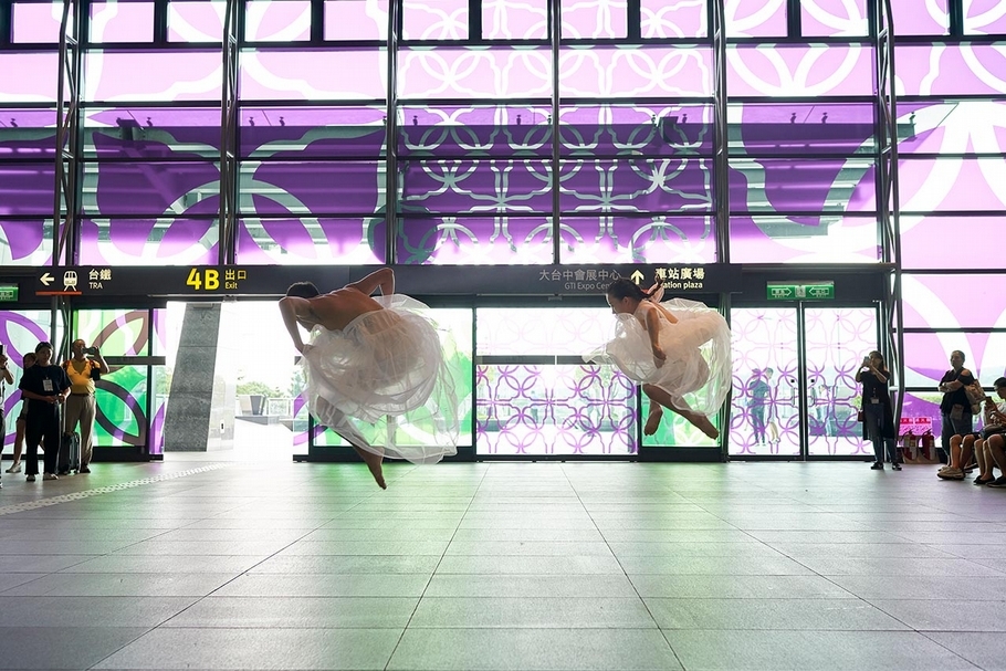 魔梯形體劇場於台中高鐵站的演出與來往旅客「不期而遇」。(攝影/莊坤儒,國家文化藝術基金會提供)