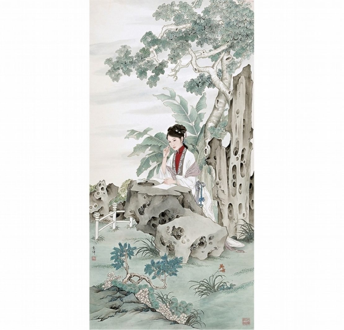 人物畫中的背景、用具雖為陪襯,卻需要大量功夫表現。王意評作品中最讓人印象深刻之處,便是此二。人物之美,不僅是面容姣好、身段窈窕,其氣質內涵最難表現。王意評的仕女姿態嫺雅,面容端莊秀美,氣質溫婉平和,人物或是身著明清服飾的古代大家閨秀,或身著現代旗袍的摩登仕女,不變的是典雅煦人的畫面氛圍。她們的行事及所處環境,亦是形塑其氣質的要點之一。年輕畫家極為重視衣著及背景細節,畫中仕女由其衣著可粗分為古代仕女及摩登女郎,各自處於相呼應的環境中。《桐陰覓句》中仕女坐於石桌前,身著淡雅褙子及深紅內裳,臂上藕色披帛上細緻地描繪花樣,腕上通透的玉鐲、耳上懸著的玉珠以及髮間珠翠,表現出舊時代富有才情的名媛閨秀。《花陰倚欄》則以兩位著旗袍的女性為主角,透過圓窗,觀者可見白裳女子憑欄遠眺,豆綠女子持書翻閱,兩人眉目之間的平和、唇邊的一抹微笑,傳遞出歲月靜好的恬適氣氛。近年來,「女力」成為顯學,女性的力量或許便如同畫中,是一抹柔軟微笑下的優雅與堅持。