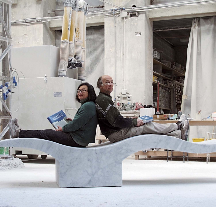 對她來說,石材不是硬的。反而像水,可以沖刷,也可以塑形。「大理石和我的個性比較接近:既剛硬且光滑,它自身本具靈光與自己的生命。」薩璨如表示,手的感覺很重要:「磨不只是磨,還要摸。一般創作者雕刻大理石時,會用上許多機具,但最後都得靠手來確定。」為完成《舞者》真如兩個跳舞的人般悠長而柔軟的動感,其曲線是以藝術家主觀的手的經驗而摸出來的。但上下顛倒皆成立且依然對稱的《穀》的曲線就是經客觀的電腦精密演算出來的。《豆椅》則結合上述兩種方式且將大理石的粗糙與細密質地加以並置,以衝突的樣態來對比和諧的造型,強化作品既合且離的雙面寓意。