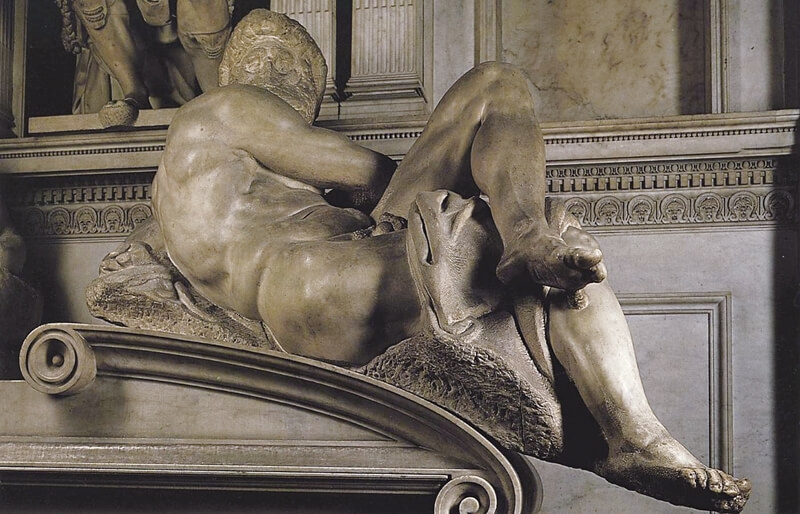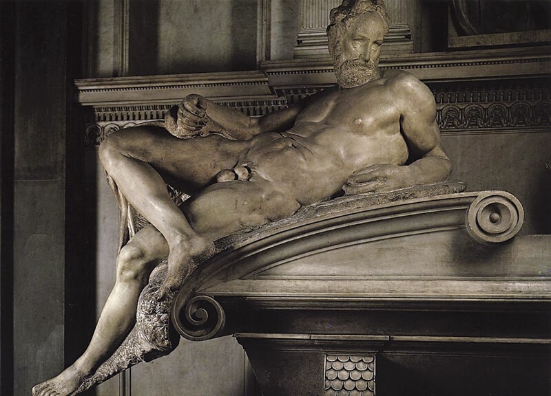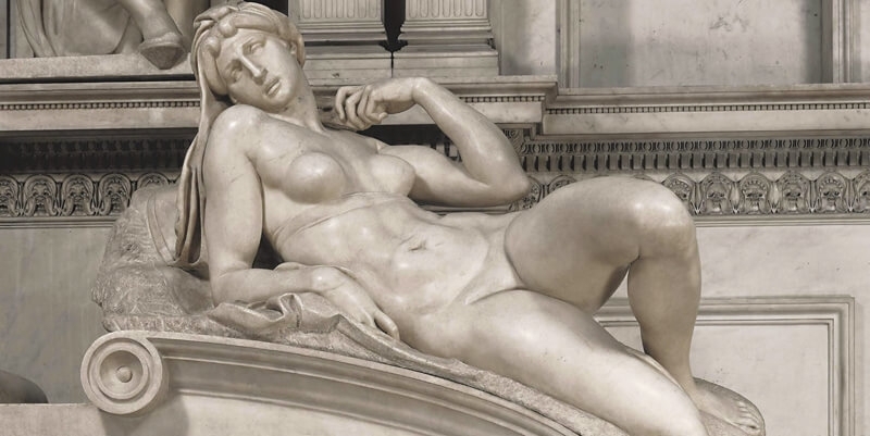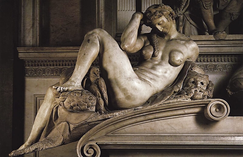 在這四尊雕像中,《夜晚》既無《白天》的劇烈扭動翻轉的姿態,也沒有《黃昏》展現的疲憊神情,更不像《黎明》有動人的無奈苦楚,然而《夜晚》卻是最感動人心,因為米開蘭基羅在《夜晚》雕像中表達了你我共同的感觸:苦楚人生,最好能永遠沉浸在睡夢中,不必醒來面對白天現實的挑戰,這也解釋了為何《白天》呈現出些微厭世的感覺。米開蘭基羅又將夜晚與死亡連結,使得日夜的循環似乎蘊含生死輪迴的意涵。此外,《夜晚》雕像所呈現的身體比例與結實的肌肉,顯示米開蘭基羅習慣使用男性模特兒,在男人身體硬生生加上乳房,勢必顯現不合乎女人身軀的解剖結構。