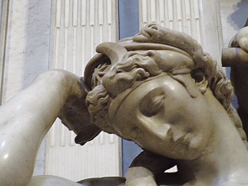 另一側以手支撐著頭的女人則象徵熟睡的《夜晚》,在這四尊雕像中,只有《夜晚》躺在一塊布單上,象徵夜幔低垂;只有《夜晚》伴著象徵物,頭冠中央有一個弦月,弦月的中間還有一個星星的造型,一隻貓頭鷹、一個面具以及一束植物。《夜晚》女人低垂的臉顯得安詳寧靜,但是身體稍向外翻、左腿略微內傾、左胳膊向後支撐身體,而右手肘輕輕地朝前撐在左大腿上,以不明顯扭轉的身體表現寧謐的深夜其實並不安寧。米開蘭基羅曾就《夜晚》抒寫了數首詩文,其中一首如下: