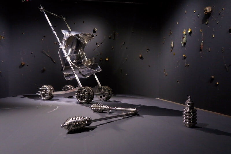 圖中為史金淞《鐮刀版嬰兒車》與「奶瓶」系列作品。(台北當代館提供)