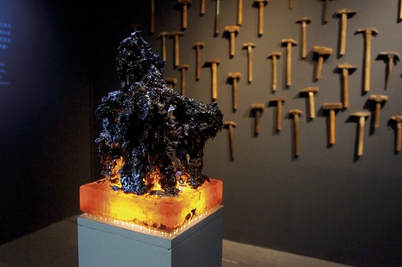 前方作品由燃燒後的殘渣凝結成型,再生產成一件迷你太湖石似的「園林」賞件。(台北當代館提供)