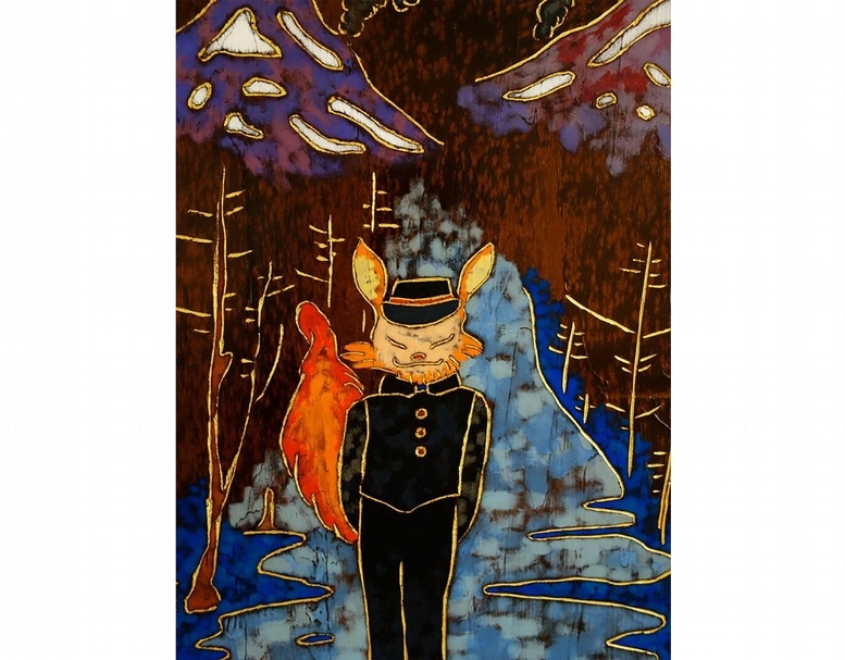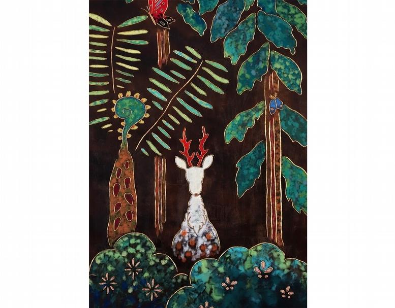 夏愛華,穿越結界而來ー鹿,120x80x5cm,生漆、金箔、岩彩、松木拼板,2016。